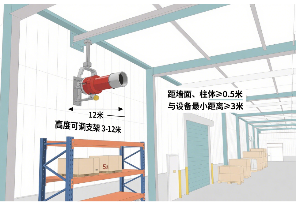 对于有行车、起重机的工业厂房,消防炮需避开设备运行轨迹,安装位置与设备最小距离≥3 米,防止机械碰撞损坏炮体。