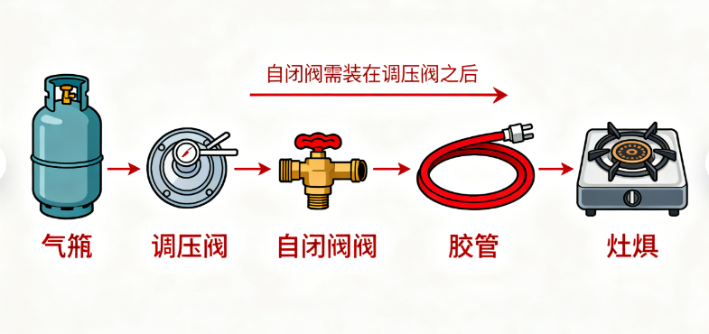 安装顺序不能错必须遵循 “气瓶→调压阀→自闭阀→胶管→灶具” 的顺序,不可将自闭阀装在调压阀之前 —— 若先装自闭阀,调压阀的压力波动会误触发自闭阀关断,导致用气中断;